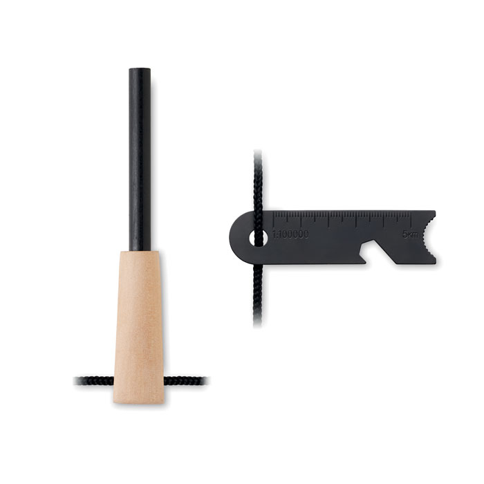 Alati za paljenje vatre od borovine i nehrđajućeg čelika koji uključuju štapić za paljenje, višenamjenski strugač za korištenje s vašim upaljačem, otvarač za boce, preciznu ravnalu i imbus ključ.